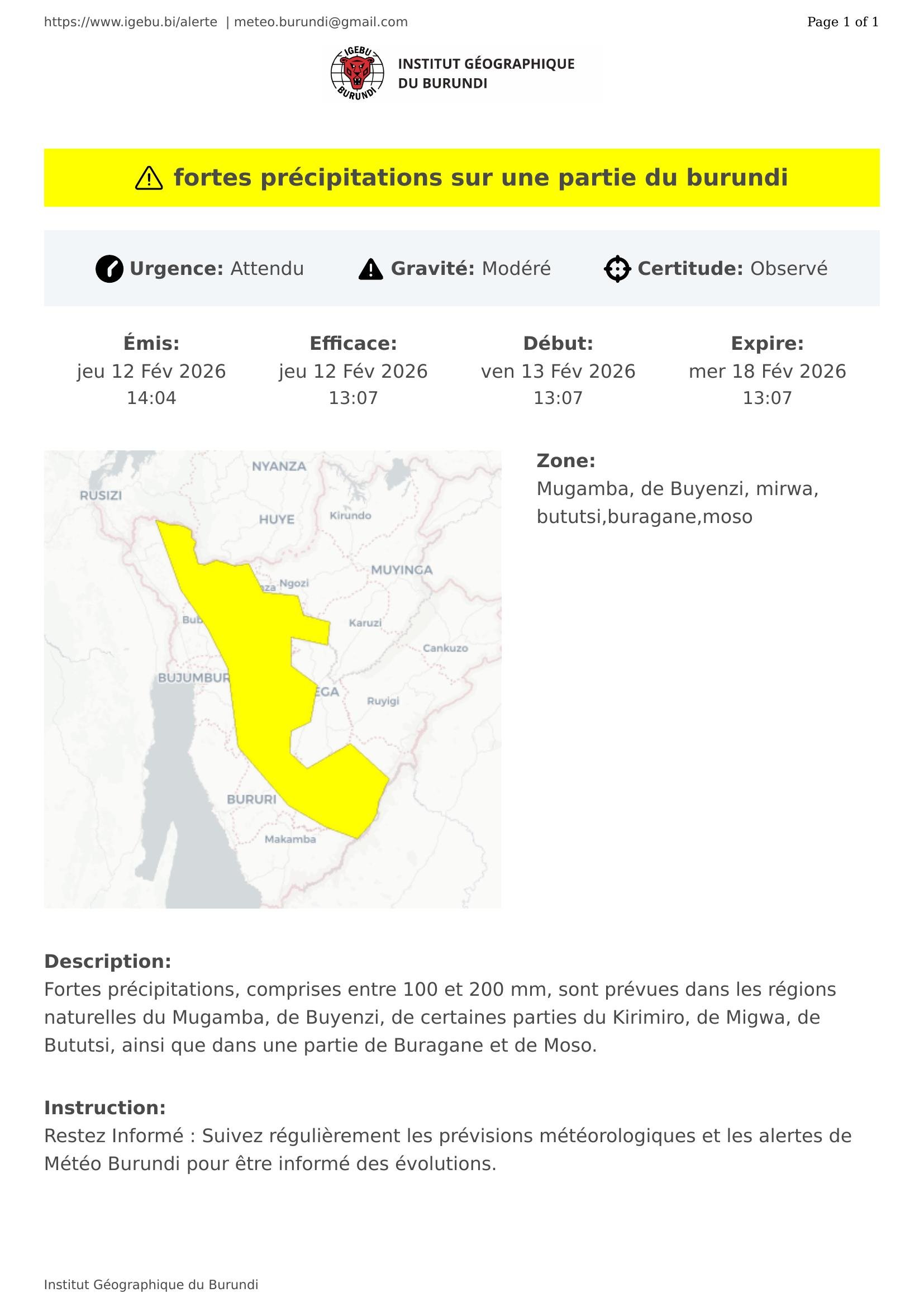 Fortes précipitations, comprises entre 100 et 200 mm, sont prévues dans les régions naturelles du Mugamba, de Buyenzi, de certaines parties du Kirimiro, de Migwa, de Bututsi, ainsi que dans une partie de Buragane et de Moso.