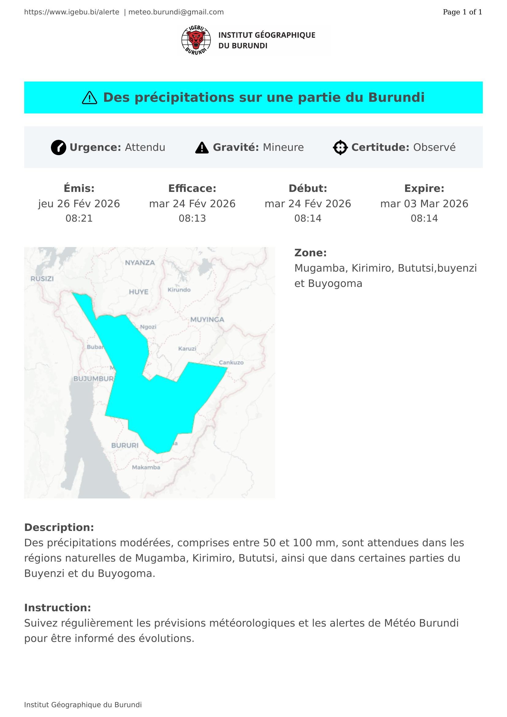 Suivez régulièrement les prévisions météorologiques et les alertes de Météo Burundi pour être informé des évolutions.