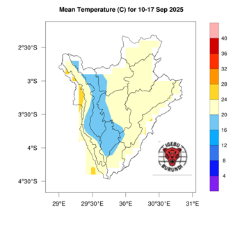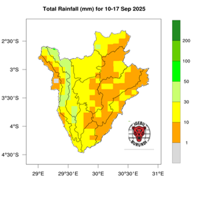 Des précipitations, estimées entre 10 et 50 mm, sont attendues dans certaines zones des régions naturelles du pays, notamment à Mugamba, Migwa, Buyenzi, ainsi que dans certaines parties de Kirimiro, Bututsi et Bugesera. De très faibles précipitations sont prévues dans les autres régions du pays.