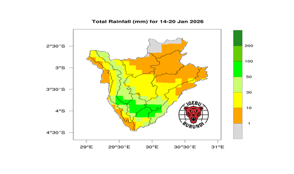- Des précipitations modérées, comprises entre 50 et 100 mm, sont attendues dans certaines zones des régions naturelles de Mugamba, Bututsi, Buyogoma ainsi que dans certaines parties du Buragane. Des précipitations faibles, comprises entre 10 et 30 mm, sont prévues dans le reste des régions naturelles du pays, à l’exception de certaines parties du Bugesera, du Buyenzi, du Kirimiro, de l’Imbo, du Moso et du Buyogoma, où des précipitations très faibles, inférieures à 10 mm, sont attendues.