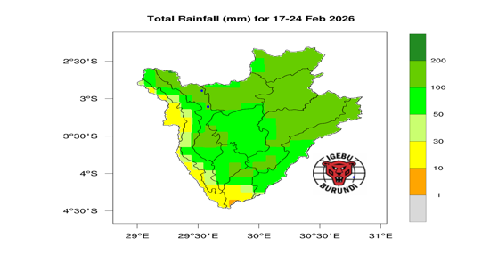- Fortes précipitations, comprises entre 100 et 200 mm, sont prévues dans les régions naturelles du Mugamba, du Buyenzi, du Bugesera, ainsi que dans certaines parties du Kirimiro, du Bweru, du Buyogoma, du Bututsi et du Moso .