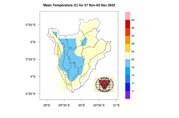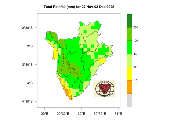 - Fortes précipitations, comprises entre 100 et 200 mm, sont prévues dans les régions naturelles de Mugamba, ainsi que dans certaines parties de Migwa et de Kirimiro. Des précipitations modérées, situées entre 50 et 100 mm, sont attendues dans le reste des régions naturelles du pays, à l’exception de certaines zones du Bugesera, de Buyogoma, de l’Imbo et du Moso, où de faibles précipitations, estimées entre 10 et 30 mm, sont prévues.