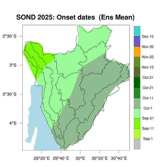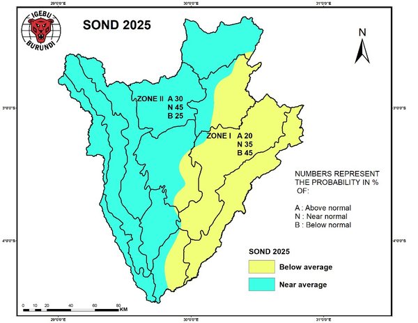 La période septembre – décembre 2025 au Burundi sera marquée par un début légèrement précoce de la saison des pluies dans plusieurs régions naturelles et des précipitations supérieures à 300 mm, avec des températures généralement chaudes. La pluviométrie à tendance déficitaire est prévue dans les régions naturelles de Moso, Buyogoma, la partie est de Bweru, de Kirimiro et de Buragane.